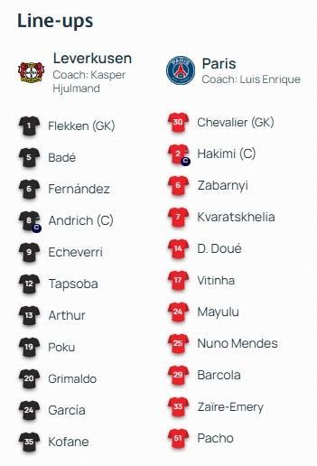巴黎客战勒沃库森:巴尔科拉搭档杜埃,KK、维蒂尼亚首发