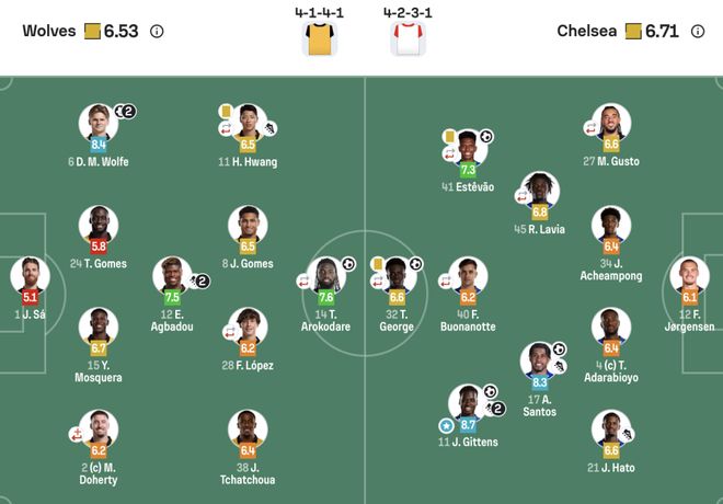 切尔西(4231):12-约根森;27-古斯托(60‘3-库库雷利亚),34-阿昌庞,4-阿达拉比奥尤,21-哈托;45-拉维亚(61‘8-恩佐),17-桑托斯;41-埃斯特旺(61‘9-德拉普),40-博纳诺特(85‘25-凯塞多),11-吉滕斯;32-乔治(76‘7-内托)