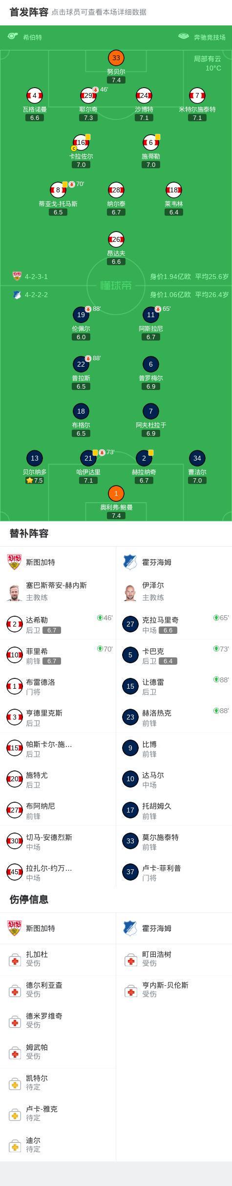斯图加特0-0霍芬海姆,两队各拿一分