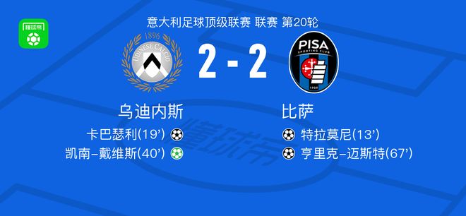 北京时间1月10日意大利足球顶级联赛 联赛 第20轮,乌迪内斯主场对阵比萨。乌迪内斯卡巴瑟利破门,凯南-戴维斯破门。比萨特拉莫尼破门,亨里克-迈斯特破门。最终比分乌迪内斯 2-2 比萨。