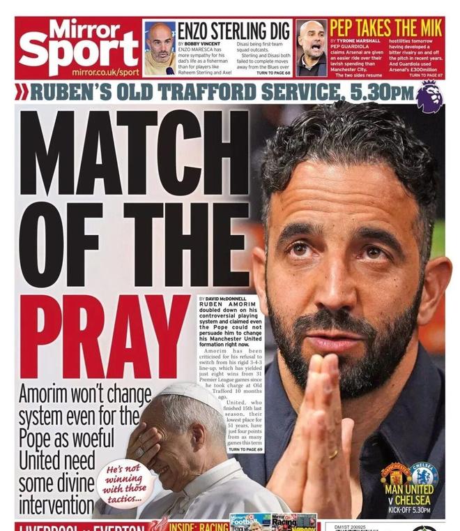 在曼联周六主场对切尔西的比赛中,鲁本·阿莫林仍将继续使用他坚持的343阵型。数据显示,他带领红魔的47场比赛,球队全是343打法,没有任何例外。葡萄牙人表示,即使教皇出马,也无法让他放弃自己视如至宝的343战术。