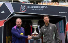 传统环节,西超杯决赛前弗里克和阿隆索在奖杯前合影 -
